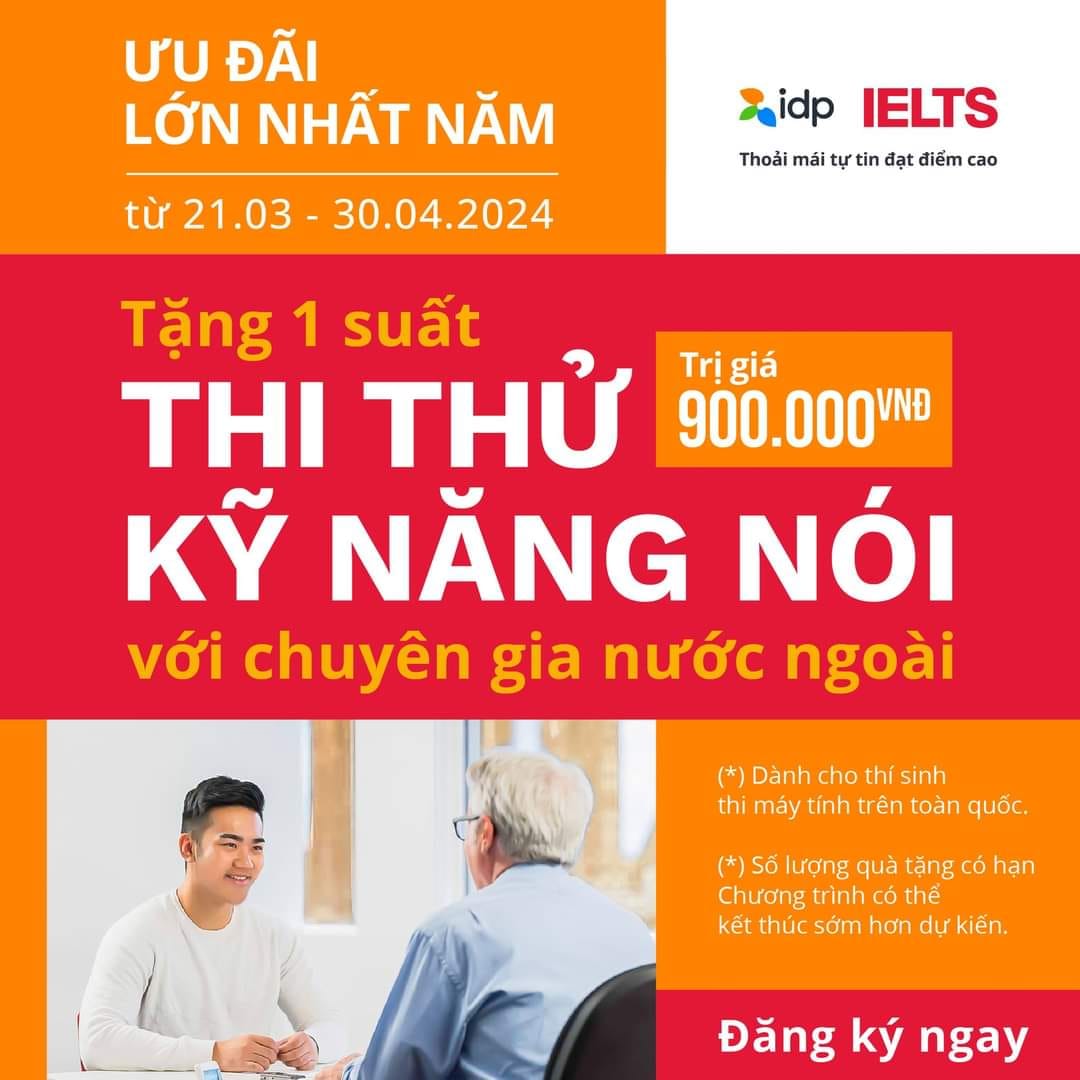 • Mỗi thí sinh đăng kí và hoàn tất lệ phí thi IELTS trên máy tính trong thời gian 21.03.2024-30.04.2024 thông qua đối tác sẽ nhận được một suất thi thử kỹ năng Nói cùng chuyên gia người nước ngoài trị giá 900.000 VNĐ.