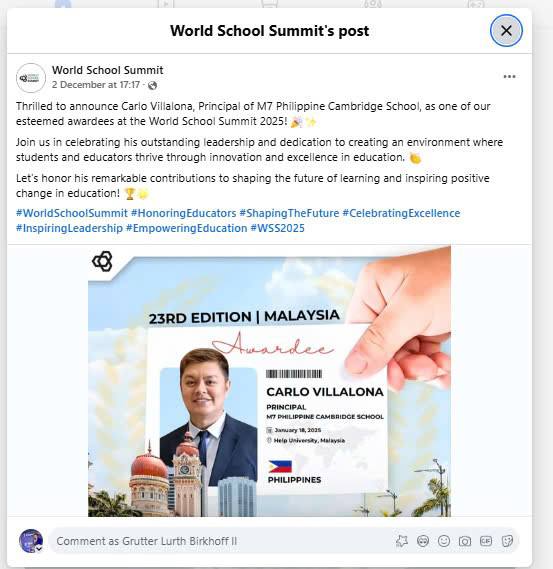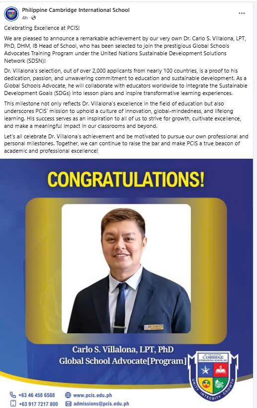 Là một Nhà vận động Giáo dục Toàn cầu, Tiến sĩ Carlo Villalona sẽ hợp tác với các nhà giáo dục trên thế giới để tích hợp các Mục tiêu Phát triển Bền vững (SDGs) vào kế hoạch bài giảng. Thông qua các trải nghiệm học tập sáng tạo, thầy truyền cảm hứng và đóng góp vào sự phát triển xã hội toàn cầu.